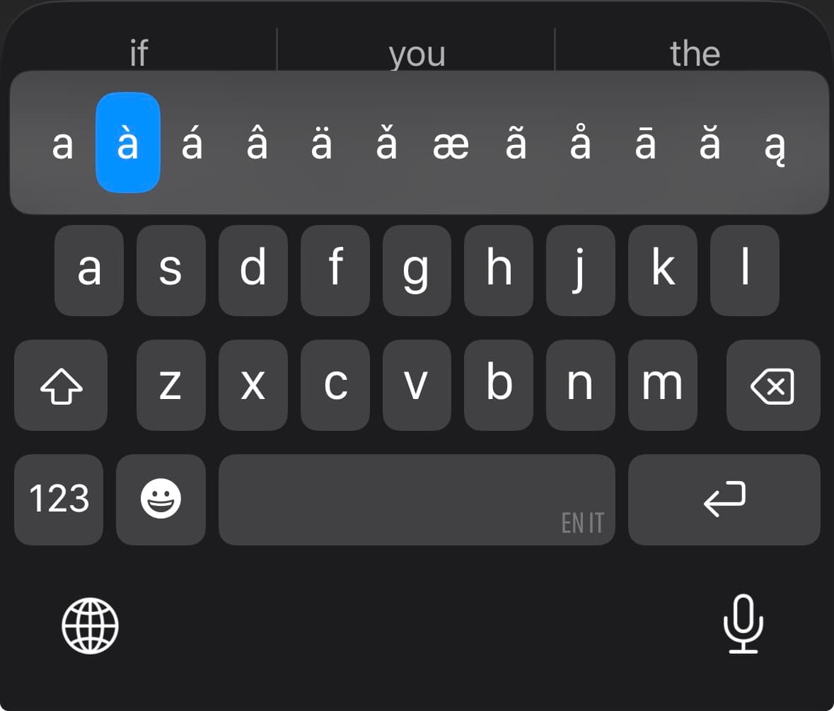For example, if I keep the a key pressed, I get all the variants for that letter.